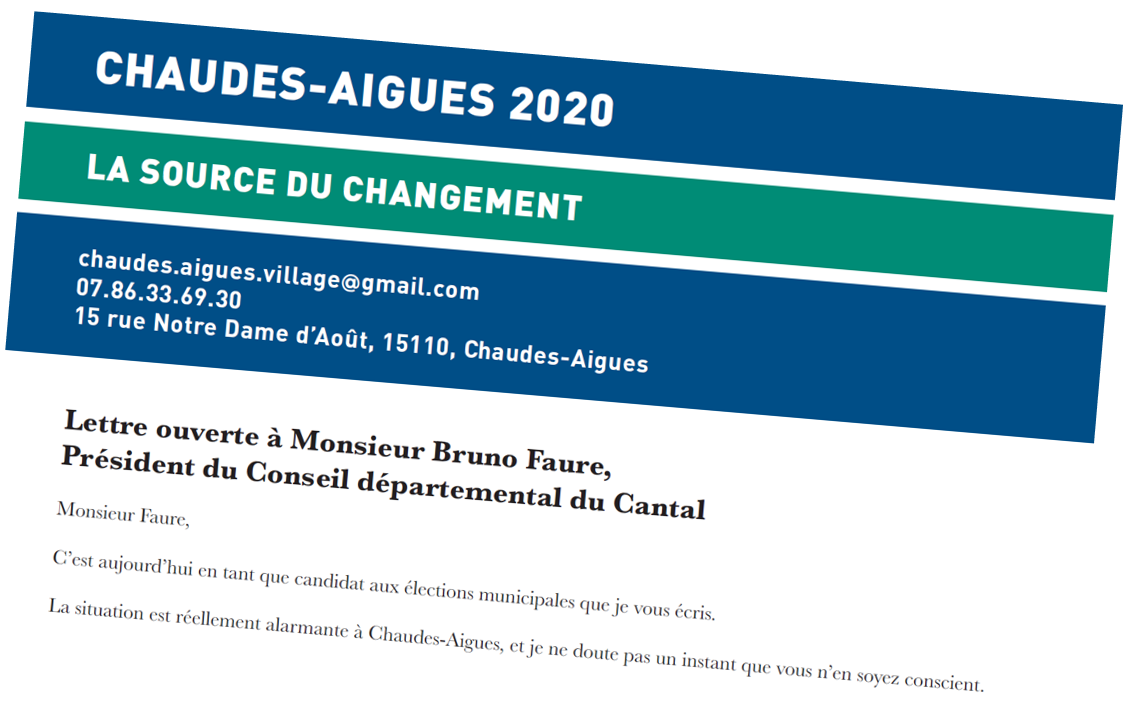 Face à la situation alarmante dans laquelle est plongé le village de Chaudes-Aigues depuis près d’un an et demi, j’ai adressé une lettre ouverte à Monsieur Bruno Faure, Président du Conseil départemental du Cantal.