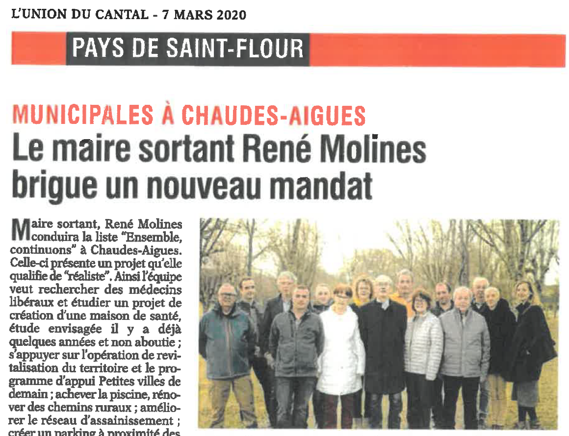 Elles et ils s’appellent Arlette Boudon, René Brandely, Hervé Caldaguès, Agnès Chalmeton ou encore Isabelle Charbonnier. Ces femmes et ces hommes sont cités dans l’édition du 7 mars 2020 de L’Union du Cantal car ils ont rejoint la liste « Ensemble, continuons », conduite aux élections municipales par René Molines, maire sortant de Chaudes-Aigues.