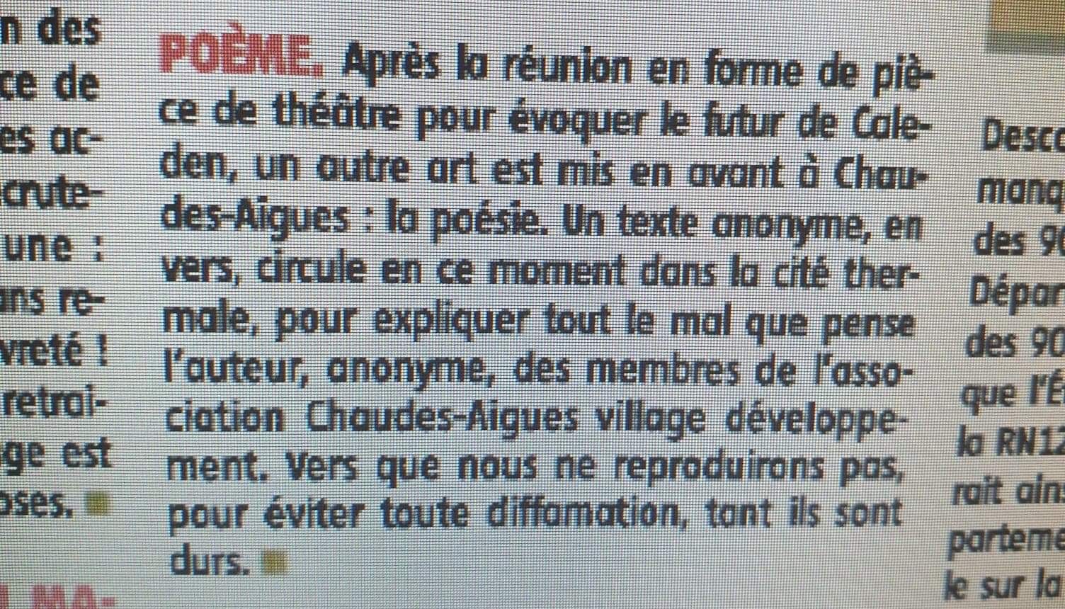 Après la réunion en forme de pièce de théâtre pour évoquer le futur de Caleden, un autre art est mis en avant à Chaudes-Aigues : la poésie. Un texte anonyme, en vers, circule en ce moment dans la cité thermale, pour expliquer tout le mal que pense l’auteur, anonyme, des membres de l’association Chaudes-Aigues Village Développement. Vers que nous ne reproduirons pas, pour éviter toute diffamation, tant ils sont durs.