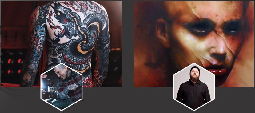 Tous deux born and raised au pays de l’Oncle Sam, Dave Koenig et Joshua Carlton ont compté parmi les ambassadeurs du tattoo made in USA au Cantal Ink 2017. Quand le créneau du 1er est l’encrage japonisant teinté d’Art nouveau et d’Americana, le 2nd, lui, donne dans le réalisme tirant vers l’épouvante et le tatouage pour public averti. 2 écoles pour 2 immenses artistes.