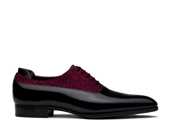 De cette réflexion sont nées deux Richelieu, pensées comme deux lectures d’un même esprit. La première associe un cuir noir profond à une pièce de chevreau rouge et noir, apportant une texture plus vibrante et un contraste maîtrisé. La seconde décline cette même construction dans une version plus retenue, où le chevreau s’exprime entièrement en noir, par nuance plutôt que par opposition.