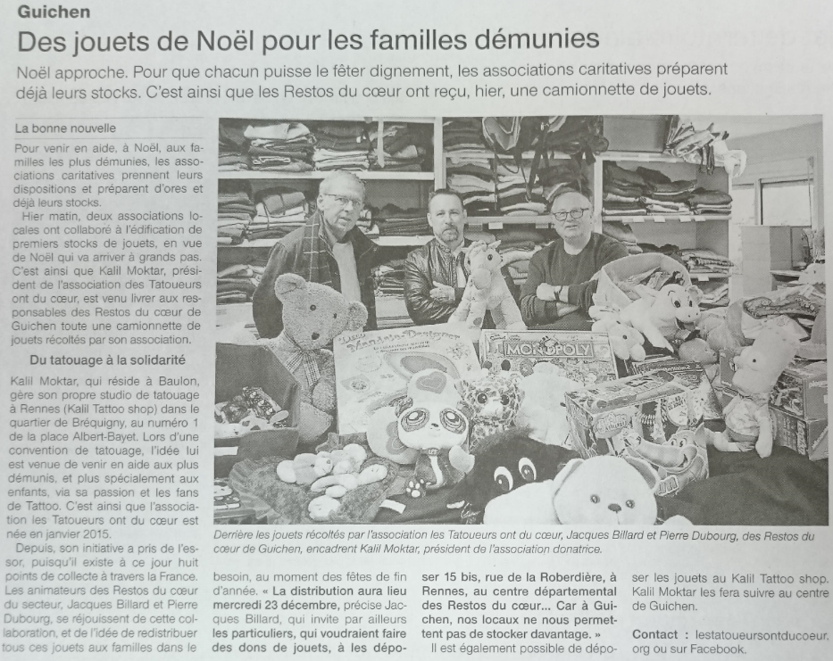 C’est aux Restos du cœur de Guichen, commune du département d'Ille-et-Vilaine, que le tatoueur rennais est venu remettre les jouets qu’il avait récoltés ces derniers mois par le biais de son association. Depuis la création des Tatoueurs ont du cœur, l’organisation a pris l’essor que son président et fondateur espérait ; aujourd’hui, ce ne sont pas moins de huit points de collecte répartis ici-et-là à travers le pays.