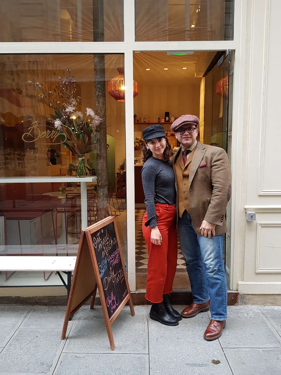 Depuis, j’ai choisi de consacrer mon temps à un territoire et un département qui me sont chers – l’Aubrac et le Cantal – ainsi qu’au Vaucluse, terres de mes premiers pas comme tatoueur professionnel. Cet exil souhaité hors des murs de la capitale ne retire rien à ma joie d’y remonter, de temps à autres. Au cours de ma dernière visite, j’ai pu goûter aux mets et boissons préparés par Shirley, ma fille, au sein du café dans lequel elle œuvre depuis 2017 : le Café Berry. L’occasion, entre un matcha et une pâtisserie, de prendre la pose en bonne compagnie devant la façade du 10 rue Chapon, dans le Marais.