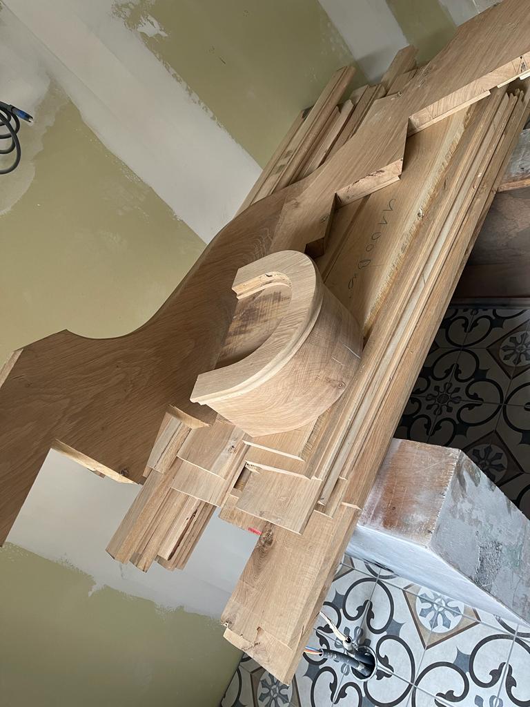 Sans relâche, Laurent s’attelle à l’escalier puisque le sol est terminé, l’escalier est considéré comme un meuble et vient se poser et trouve sa place sur un sol fini. En voici quelques morceaux.