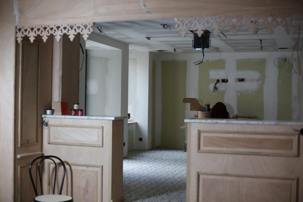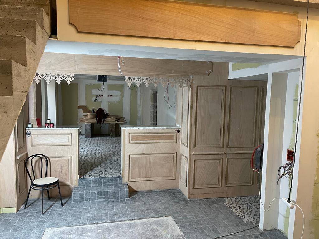 Vraiment doué dans le domaine du bois, Laurent a presque terminé la façade intérieure de notre futur restaurant à Chaudes-Aigues.