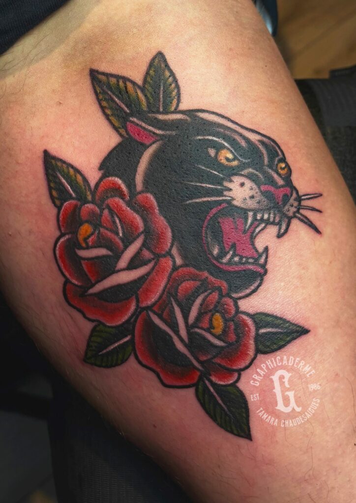 Les projets en couleur occupent une place importante dans son travail. Ils demandent une maîtrise précise des dégradés, des contrastes et de la tenue des pigments dans le temps. Le choix des teintes n’est jamais décoratif : il sert la lecture du motif, son mouvement et sa présence sur le corps. Qu’il s’agisse de sujets animaliers, floraux ou symboliques, chaque élément est pensé dans une logique d’ensemble.