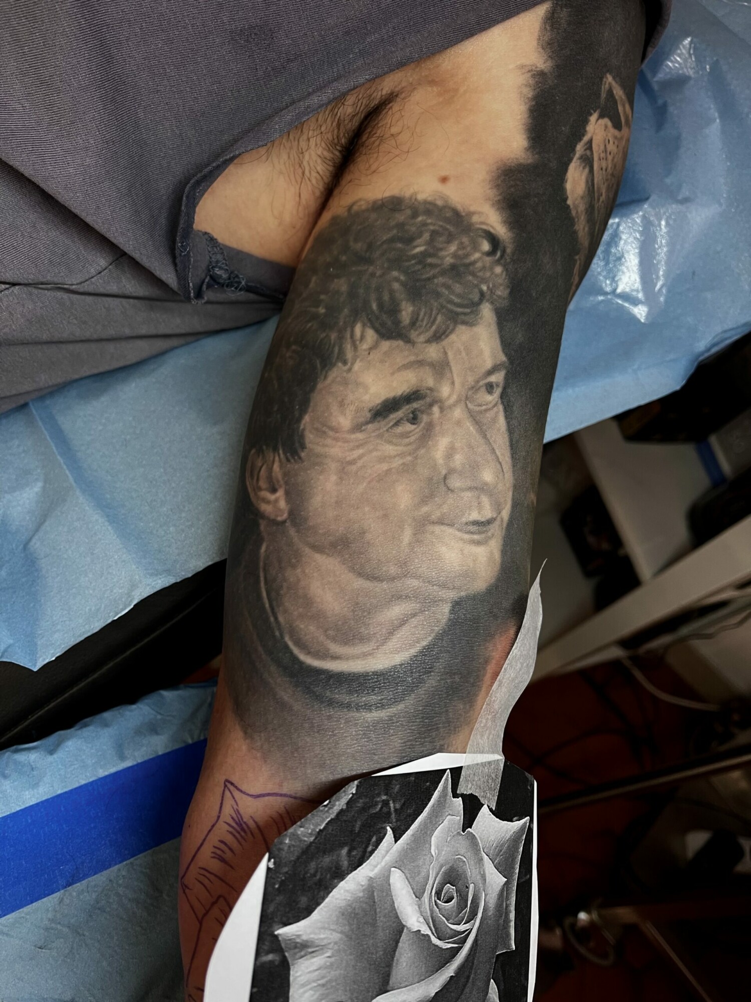 Ce portrait a été réalisé d’après un document photo, qui n’offrait pas beaucoup de latitude malgré tout. Mais le cliché nous aura permis de matérialiser une approche très personnelle : celle d’un homme, qui souhaitait porter sur lui, dans sa chair, le souvenir plus présent de son papa.