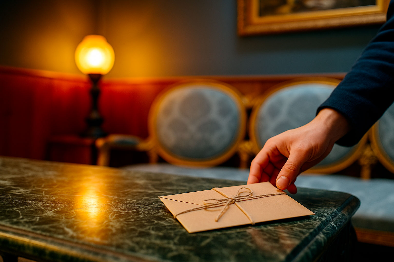 Ce geste simple, modeste, sans emphase, dit déjà tout : voici du temps. Voici une parenthèse. Voici quelque chose qui t’appartient, sans te peser, sans t’enfermer. Une main posant une enveloppe sur une table pourrait être celle de n’importe qui : un proche, un ami, un enfant, un amoureux, un collègue. Elle pourrait être posée dans le Salon Bleu, ou sur une table du restaurant, ou même chez soi avant que le cadeau change de mains.