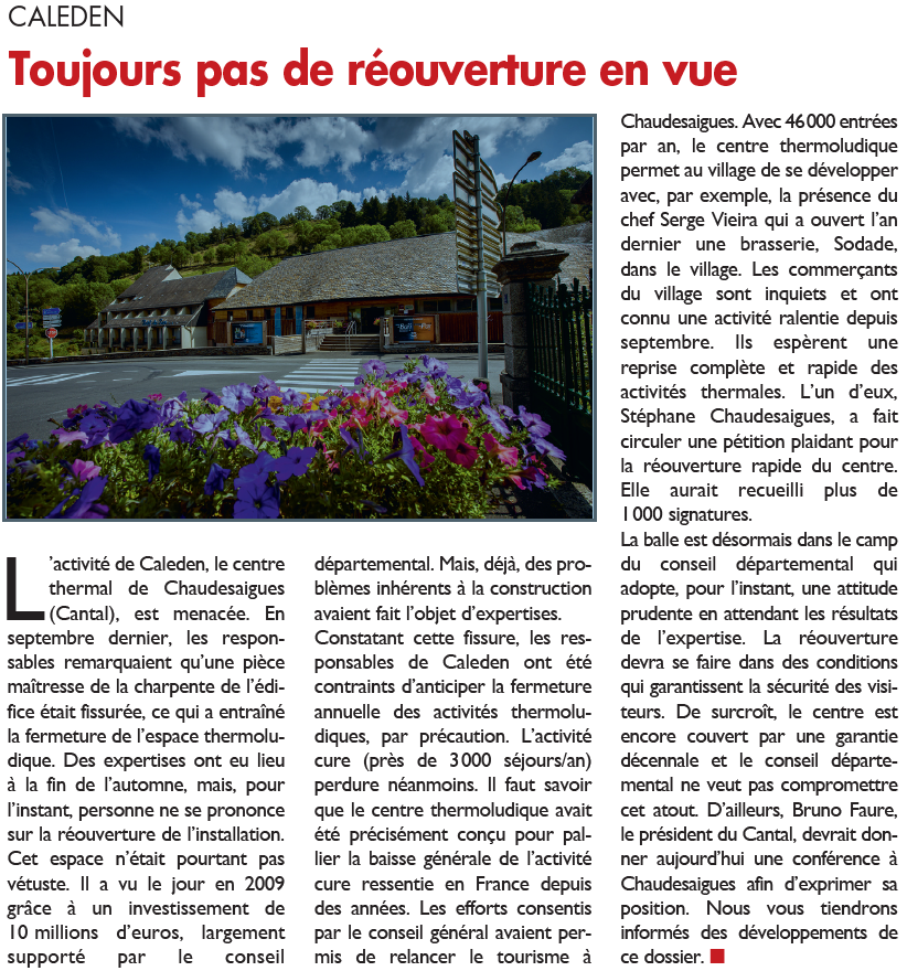 "L’activité de Caleden, le centre thermal de Chaudesaigues (Cantal), est menacée", rapportait L’Auvergnat de Paris le 6 février 2019. "En septembre dernier, les responsables remarquaient qu’une pièce maîtresse de la charpente de l’édifice était fissurée, ce qui a entraîné la fermeture de l’espace thermoludique".