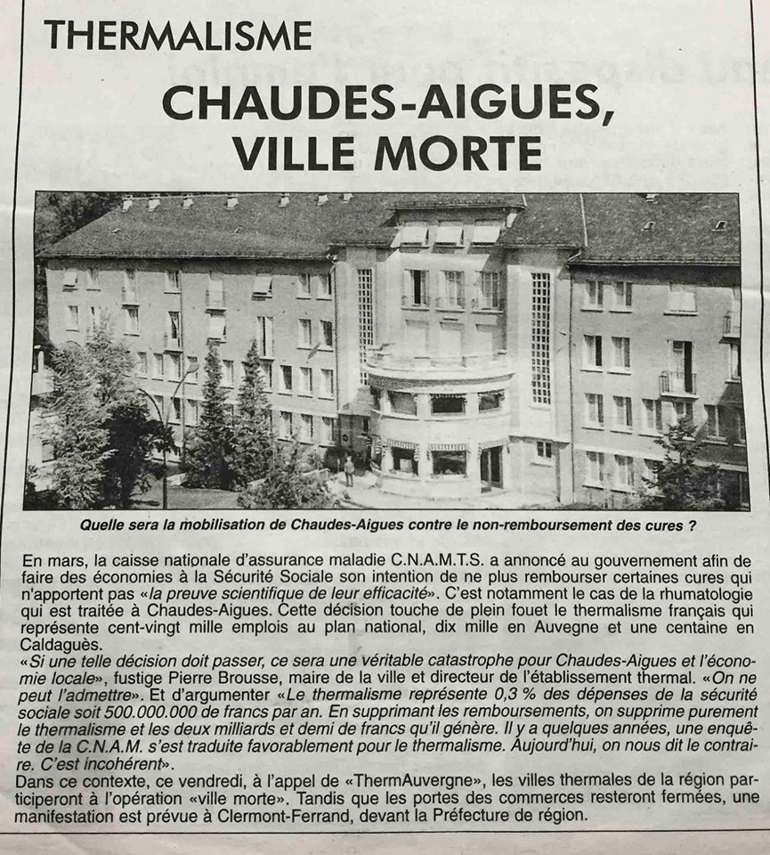 Avec ce titre, La Dépêche a-t-elle vraiment parié sur un destin funeste pour le petit village cantalien ? La réponse est non : les villes thermales de la région participaient seulement à une opération dite "ville morte", avec portes des commerces fermées. La raison d’une mesure aussi drastique, c’est que "la caisse nationale d’assurance maladie CNAMTS a annoncé au gouvernement, afin de faire des économies à la Sécurité Sociale, son intention de ne plus rembourser certaines cures qui n’apportent pas la preuve scientifique de leur efficacité". Or, parmi les secteurs directement concernés figure "la rhumatologie […] traitée à Chaudes-Aigues", pouvait-on lire dans le journal.