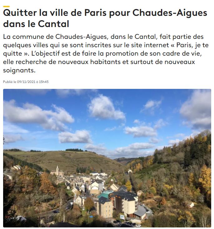 En juin 2021, je publiais sur ce blog un billet titré Paris : je te quitte pour Chaudes-Aigues. J’y évoquais le site internet Paris je te quitte, dédié à celles et ceux caressant l’espoir ou l’envie de quitter la Ville-Lumière et sa banlieue pour la France dite par certains « périphérique ». Cinq mois plus tard, France 3 rappelle que « la petite cité de Chaudes-Aigues […] veut aussi surfer sur la vague de retour à la nature post-covid 19 » et que pour cela, « elle s’est inscrite sur le site internet ».