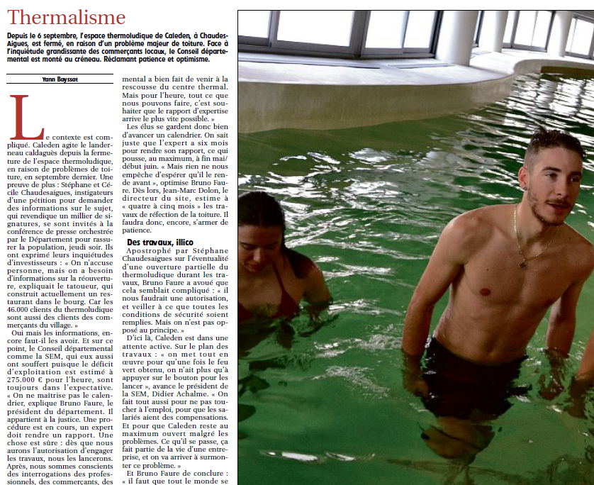 "Depuis le 6 septembre, l’espace thermoludique de Caleden, à Chaudes-Aigues, est fermé, en raison d’un problème majeur de toiture", évoque La Montagne. "Face à l’inquiétude grandissante des commerçants locaux, le Conseil départemental est monté au créneau. Réclamant patience et optimisme".