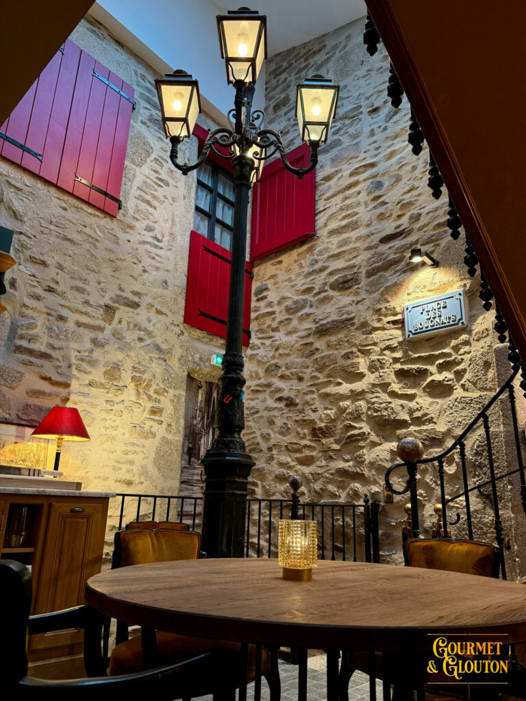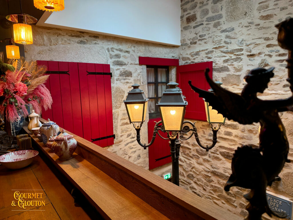 Au cœur du bâtiment, un détail raconte mieux qu’un discours l’esprit de cette maison : ce lampadaire installé comme on érige une petite place intérieure. Une lanterne extérieure qu’on aurait invitée à vivre dedans. Ses trois feux veillent sur la pierre brute et les volets rouges, éclairant non pas une rue, mais un refuge. C’est une lumière qui rassemble plus qu’elle n’éclaire, une lumière qui donne à cet espace l’allure d’un lieu de rencontre, d’attente, presque de passage. Dans un village bâti sur la chaleur des sources, cette lampe n’est pas un décor : c’est un rappel que la chaleur, ici, se cultive autant qu’elle se découvre.