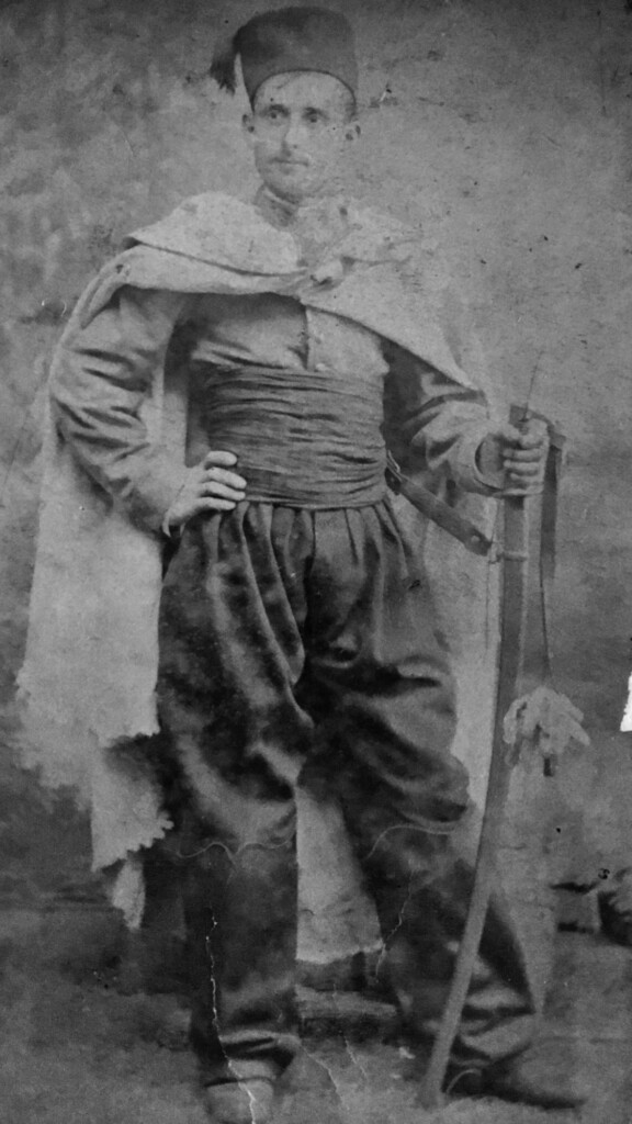 Ce fringant personnage, c’est mon arrière-arrière-grand-père, Anatole Chaudesaigues, soldat dans un corps d’infanterie français en Afrique. Créé en septembre 1830, le corps des zouaves fut organisé en 1831 et a été l’embryon des troupes indigènes : tirailleurs algériens, chasseurs d’Afrique, spahis etc. Engagés en Crimée, Italie, Indochine et Algérie, les zouaves ont été dissous en 1962.