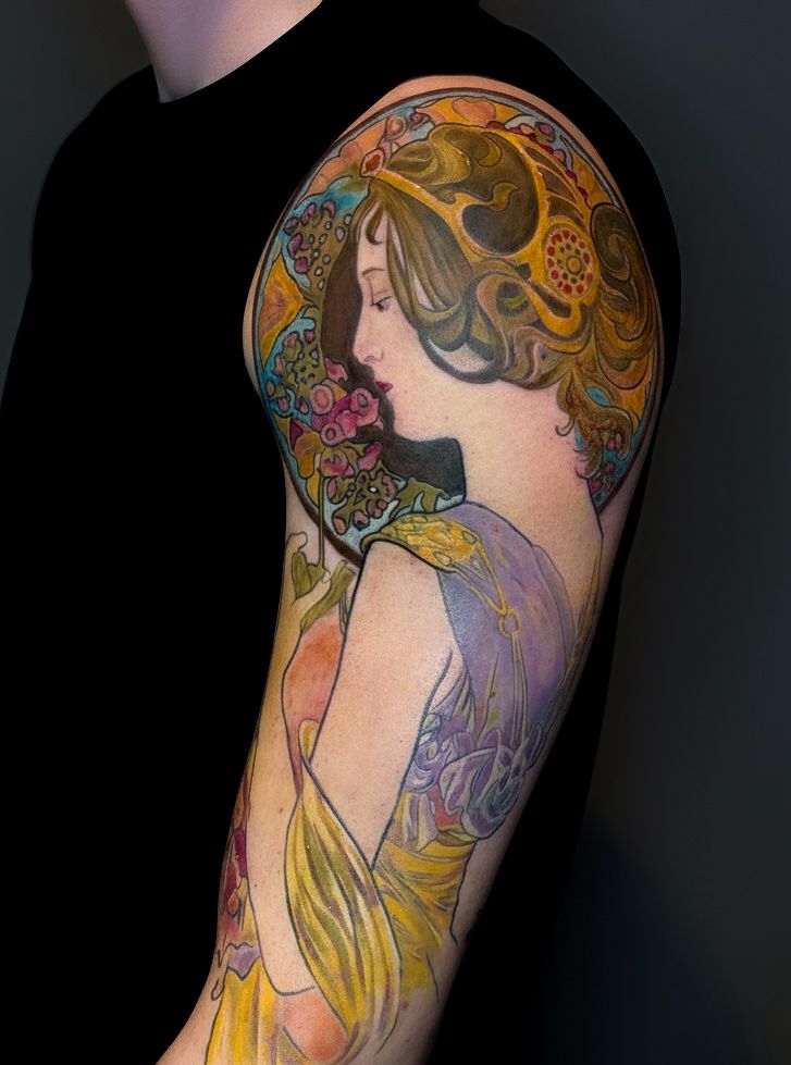 La musique, la peinture, les vêtements, la Kustom Kulture circulent dans son imaginaire. Aujourd’hui, son terrain d’exploration s’oriente vers l’Art nouveau. L’ombre d’Alphonse Mucha n’est jamais loin. Les lignes se courbent, les compositions cherchent l’équilibre, la douceur et l’harmonie trouvent leur place. La couleur ne décore pas : elle structure.