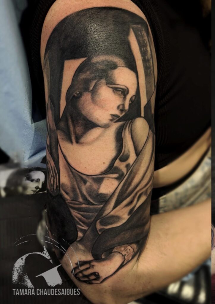Tamara travaille aujourd’hui au studio fondateur Graphicaderme à Avignon, là où tout a commencé à la fin des années 1980. Elle est également présente à Chaudes-Aigues, où nos histoires familiales et professionnelles se rejoignent. Elle pique depuis trois ans. Trois années qui, dans ce métier, ne sont pas un détail, mais une épreuve. Trois années de dessin, de peau, de précision, de concentration, de progression silencieuse.